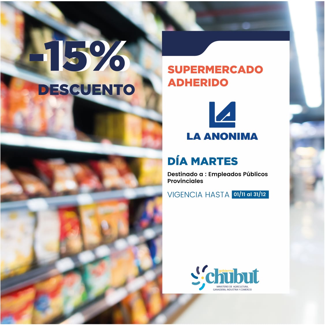 Actualmente los supermercados que brindan este beneficio son La Anónima; 15% los días martes para empleados públicos provinciales; en Carrefour 15% de descuento todos los miércoles para empleados públicos provinciales y municipales.