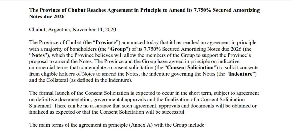 “La Provincia de Chubut anunció hoy que ha llegado a un acuerdo de principio con una mayoría de tenedores de bonos de sus Obligaciones Negociables de Amortización Garantizadas al 7,75% con vencimiento en 2026, que la Provincia cree que permitirá a los miembros del Grupo apoyar a la Provincia propuesta de modificación”, sostiene el dossier al que accedió Metadata y que está en inglés.