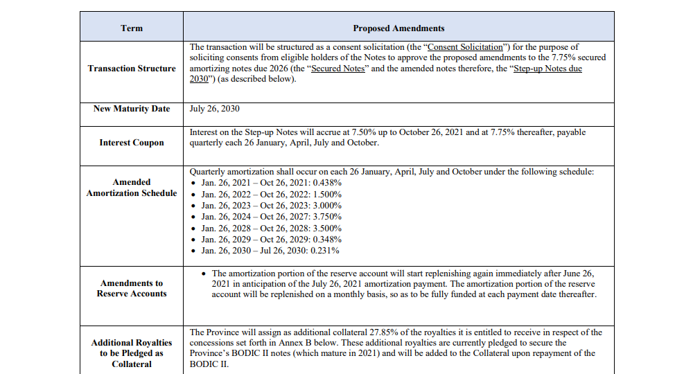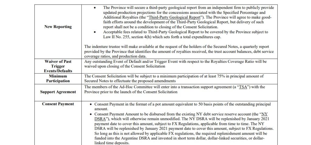“La Provincia cederá como garantía adicional el 27,85% de las regalías que tenga derecho a percibir por concepto de concesiones establecidas en el Anexo B (ver documento al final). Estas regalías adicionales están actualmente comprometidas para asegurar la Los pagarés BODIC II de la provincia (que vencen en 2021) y se agregarán a la Garantía tras el reembolso del BODIC II”, puntualiza.