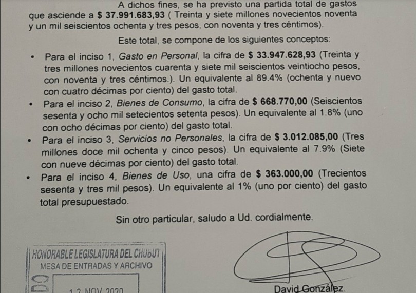 De esta manera, González explica que “se Ha previsto una partida total de gastos que asciende a $ 37.991.683”, de los cuales “para el gasto en personal es de $ 33.947.628”, lo que equivale “al 89,4% del gasto total”.