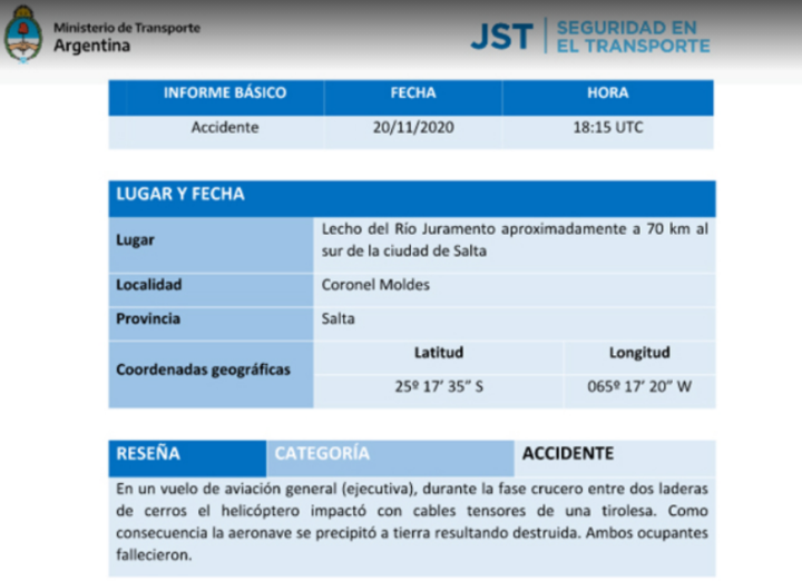 El documento oficial incluye otros datos básicos como la fecha y la hora del accidente, el lugar (lecho del Río Juramento, a 70 kilómetros del sur de Salta) y las coordenadas. También especifica datos del helicóptero (marca Eurocopter, modelo AS-350-B3, matrícula LV-FQN), dónde comenzó el vuelo (Finca las Costas) y dónde estaba previsto que aterrizara (en la localidad salteña de Joaquín V. González).