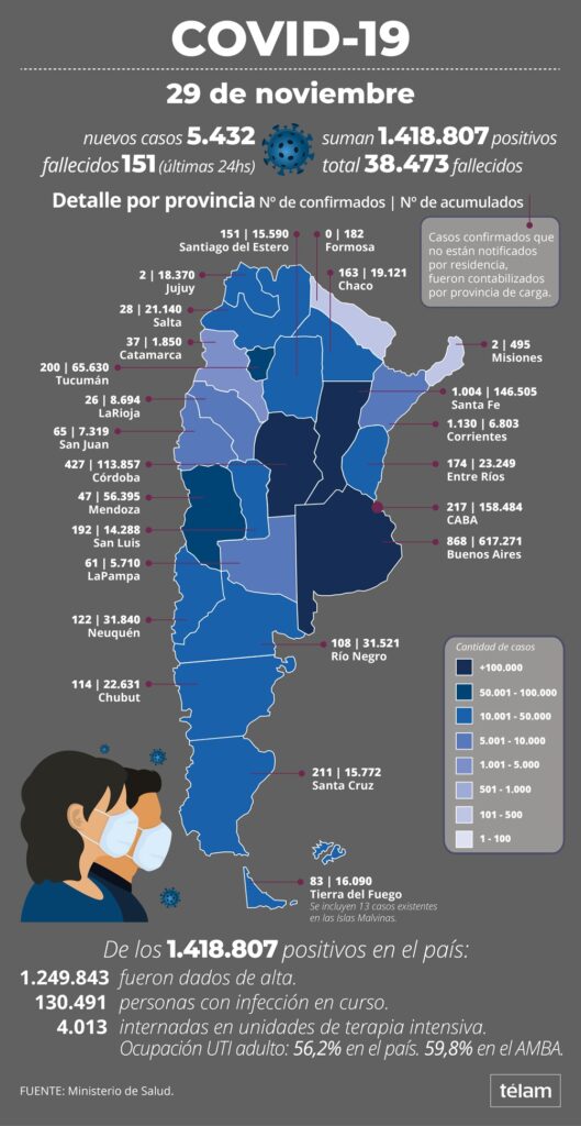 La cartera sanitaria indicó que son 4.013 los internados en unidades de terapia intensiva, con un porcentaje de ocupación de camas de adultos de 56,2% en el país y del 59,8% en la Área Metropolitana Buenos Aires. De los 1.418.807 contagiados, el 88,09% (1.249.843) recibió el alta y 130.491 son casos confirmados activos.