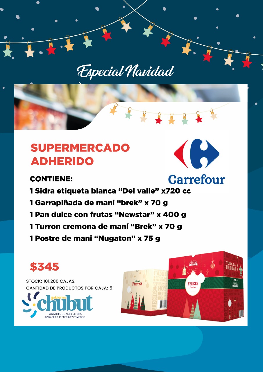 Los supermercados Vea, Chango Más, Carrefour y La Anónima de Trelew, Comodoro Rivadavia, Sarmiento, Rada Tilly, Esquel, Trevelin, Lago Puelo, Gaiman, Puerto Madryn, Rawson y Playa Unión se comprometen a comercializar una canasta navideña, compuesta por sidra, pan dulce, budín, turrón de maní y pasta de maní de marcas reconocidas.