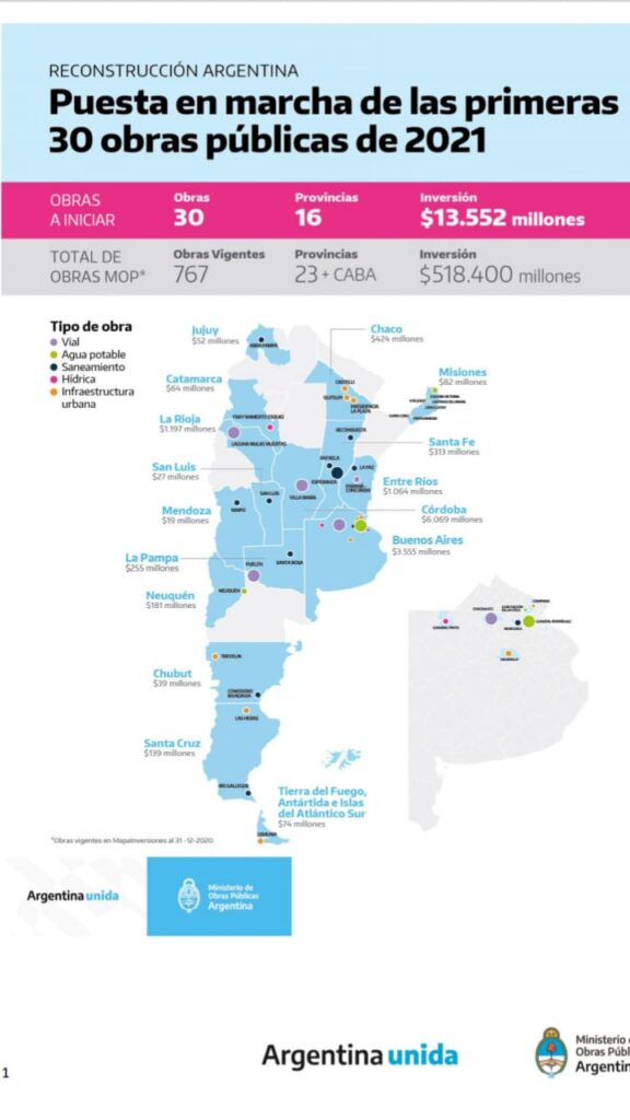 Estas iniciativas se sumarán a las 767 que se encuentran en ejecución actualmente en las 23 provincias y la Ciudad de Buenos Aires, por una inversión de 518.500 millones de pesos.