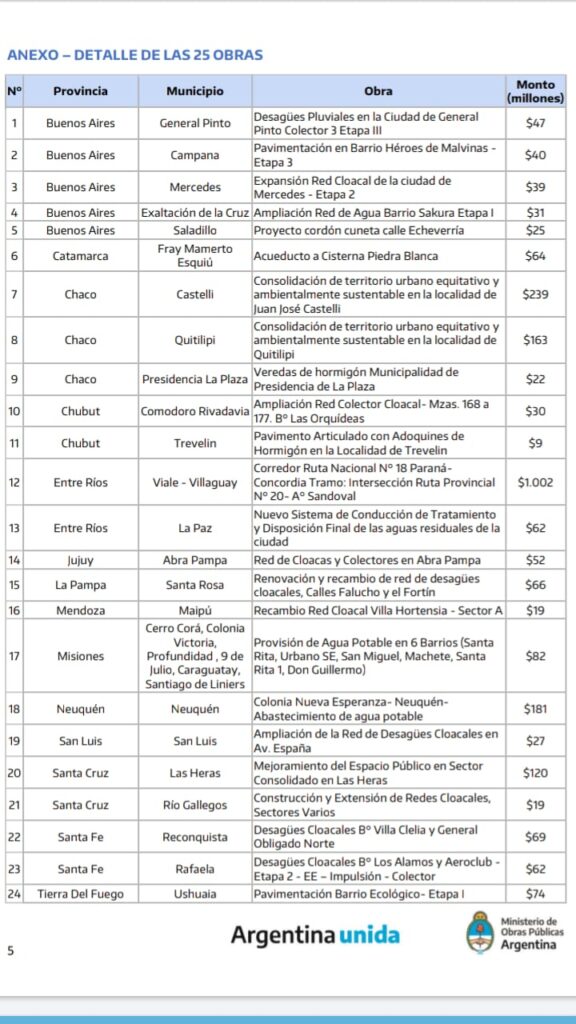 Las obras se ejecutarán en las provincias de Buenos Aires (7); Catamarca (1); Chaco (3); Chubut (2); Córdoba (1); Entre Ríos (2); Jujuy (1); La Pampa (2); La Rioja (1); Mendoza (1); Misiones (1); Neuquén (1); San Luis (1); Santa Cruz (2); Santa Fe (3) y Tierra del Fuego (1).