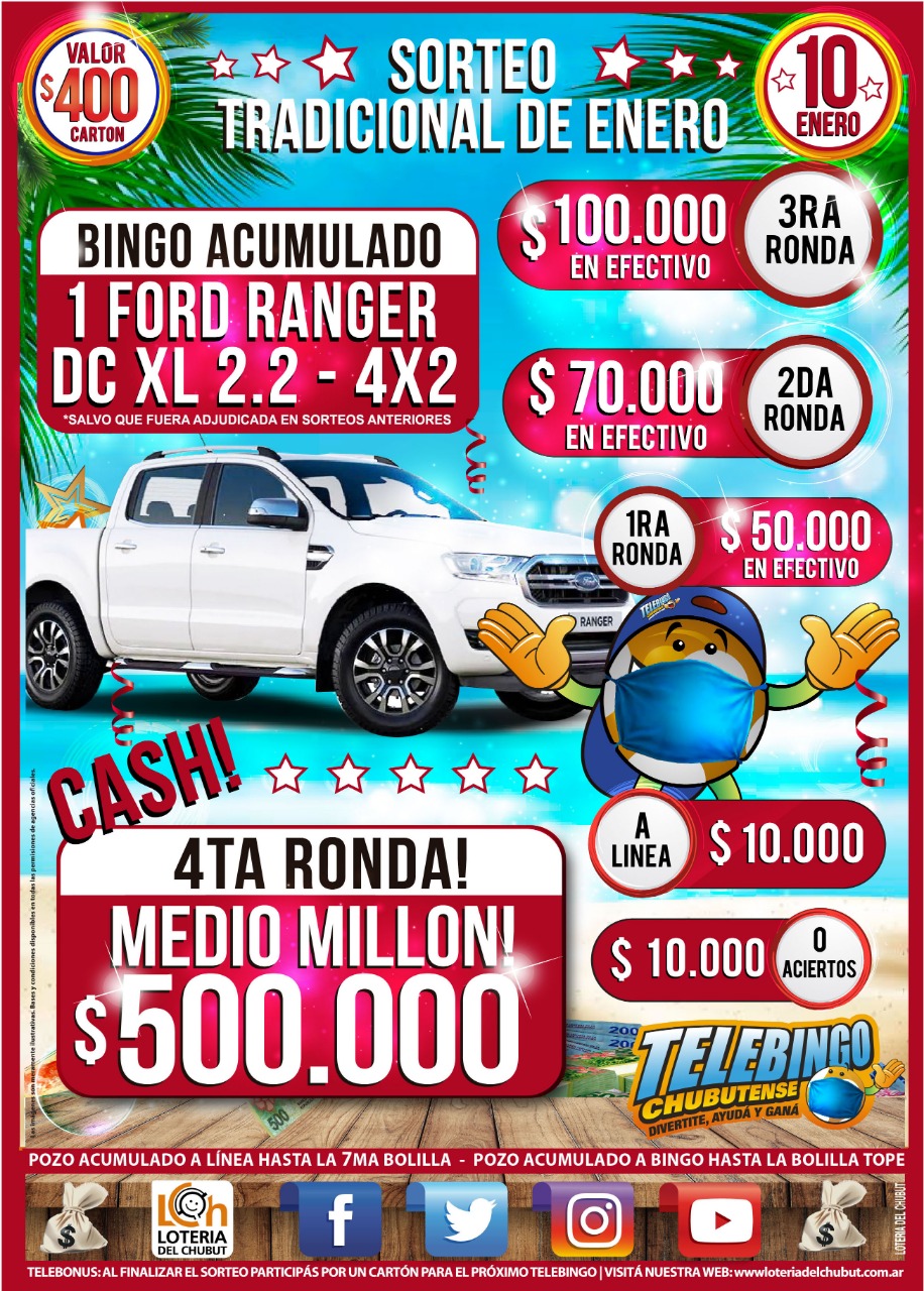 Este domingo 10 de enero a partir de las 19:00 horas, el Telebingo Chubutense pone en juego un total de 800.000 pesos en efectivo repartidos en Cuatro Rondas y una camioneta Ford Ranger doble cabina como premio a Bingo Acumulado.