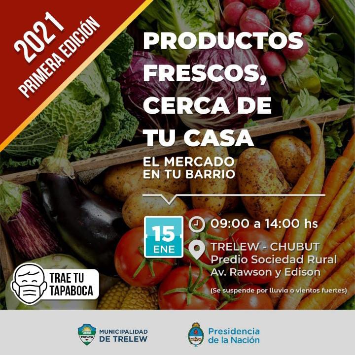 Asimismo, el Mercado en tu Barrio este sábado, estará presente junto a la tradicional Feria Paseo Trelew Primero de 8:00 a 14:00, cumpliendo con los protocolos sanitarios requeridos para un paseo de compras seguro para toda la familia. Se recuerda a los vecinos, concurrir con tapaboca y en el ingreso, se solicita el registro de cada persona, acompañado de la toma de temperatura para una mayor seguridad y prevención de contagios de Covid-19. El predio se encuentra señalizado para realizar las compras de manera rápida y en un solo sentido.