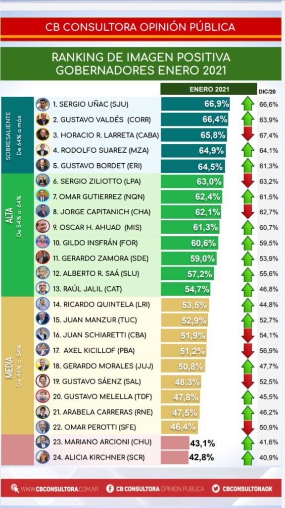 Por otra parte, los tres gobernadores que comenzaron este año con una imagen positiva sobresaliente en sus respectivas provincias fueron Sergio Uñac (San Juan), Gustavo Valdés (Corrientes) y Horacio Rodríguez Larreta (Ciudad de Buenos Aires).