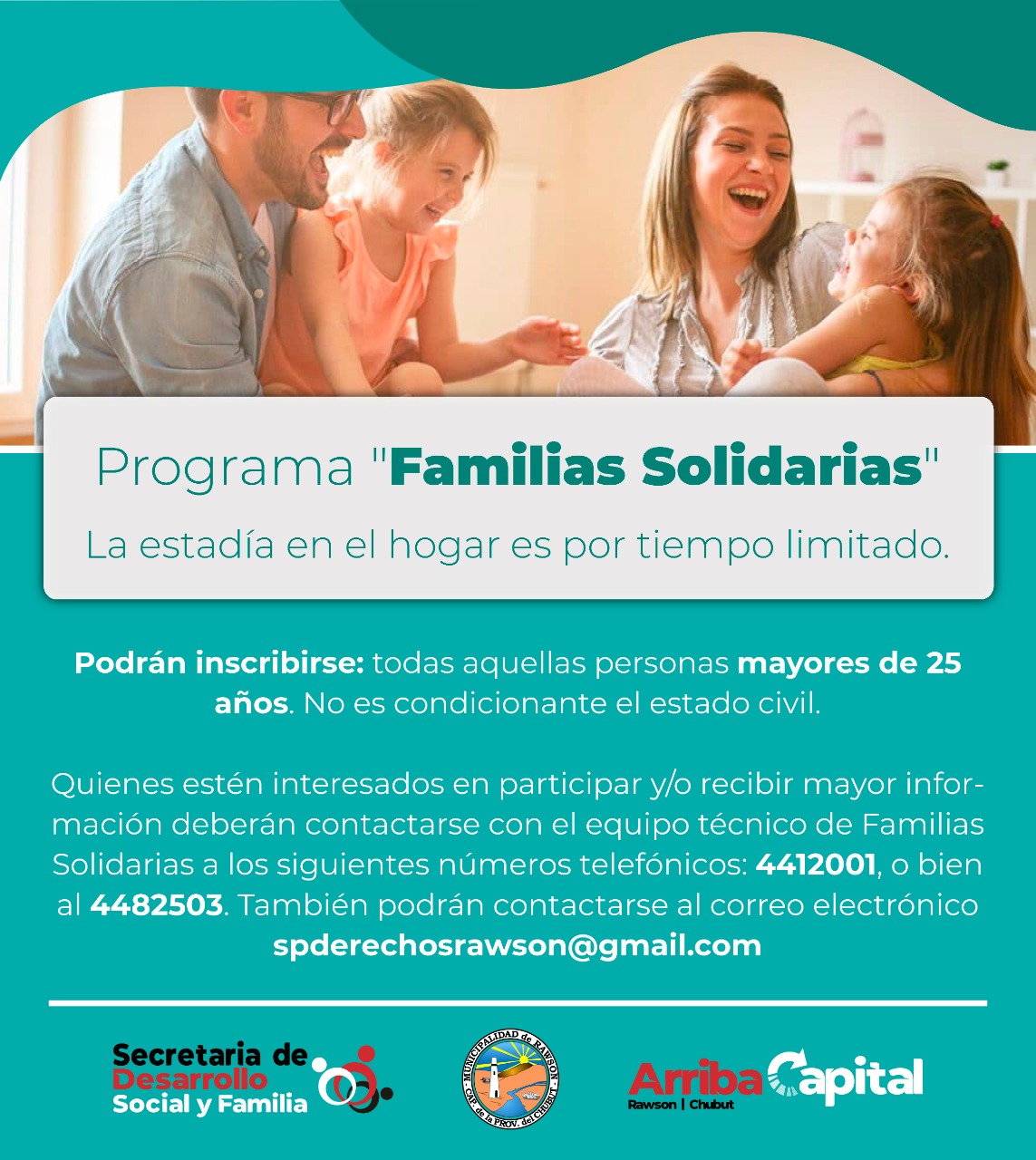 La Secretaría de Desarrollo Social y Familia de Rawson, a través del Servicio de Protección de Derechos, comunica que continúa abierta la convocatoria a los vecinos de la ciudad que quieran formar parte del programa “Familias Solidarias”.