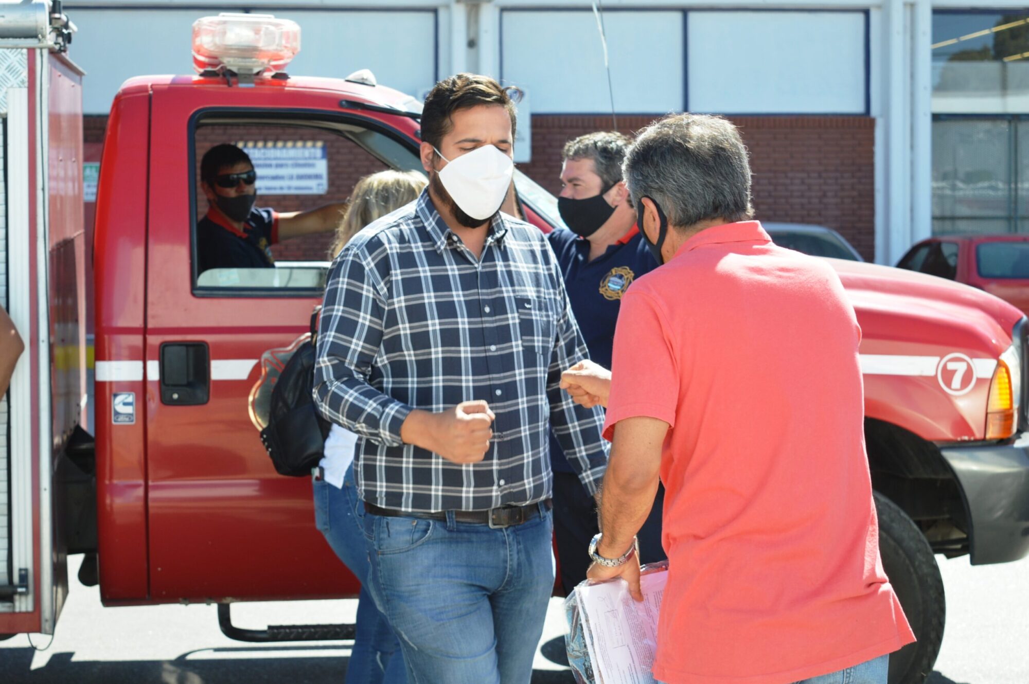 Encabezados por el presidente del cuerpo, Mauro Martínez Holley, los ediles aguardaron en la vereda de la sede legislativa el arribo de la comitiva bomberil, que llegaron a bordo de las autobombas haciendo sonar sus sirenas, estacionando en el frente del Concejo.