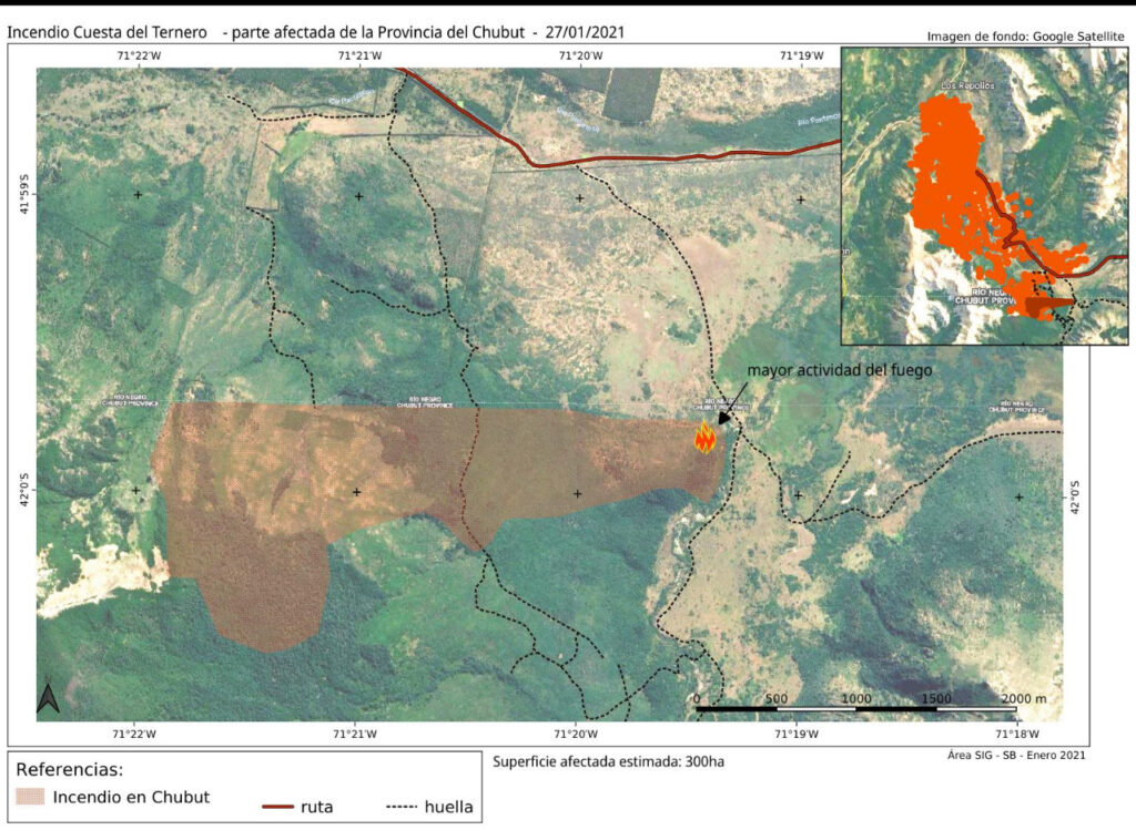 La Secretaría de Bosques, junto a otras instituciones, trabaja en el siniestro ígneo en Cuesta del Ternero, que este lunes pasó de Río Negro a Chubut. El mismo ya afectó 300 hectáreas de bosque nativo y arbustal en la jurisdicción provincial.