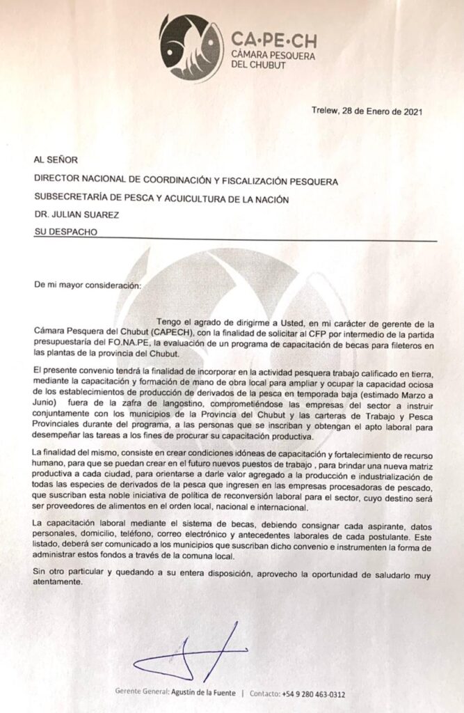 El Gerente General de la Cámara Pesquera del Chubut, Agustín de la Fuente, presentó una nota a Suárez con el objetivo de solicitar al Consejo Federal Pesquero por intermedio de la partida presupuestaria del Fondo Nacional Pesquero, la evaluación de un programa de capacitación de becas para fileteros en las plantas de la provincia del Chubut.