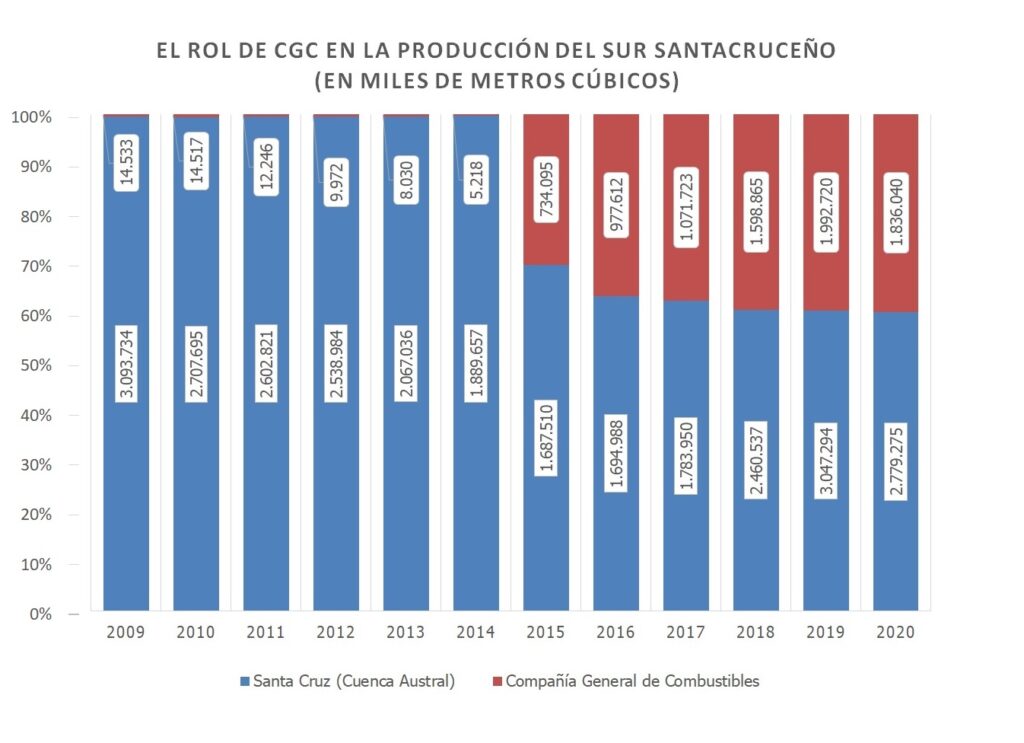 Pero una vez a cargo de CGC, las cosas dieron un giro. En el pozo mencionado, de 1.960 metros de profundidad, hubo manifestaciones de gas en las formaciones Magallanes y Anita. La empresa pasó de producir casi 40 mil metros cúbicos por día en 2009 a tener un volumen de 5 millones de metros cúbicos al cierre de 2020. CGC produce el 66% del gas de la zona sur de Santa Cruz.