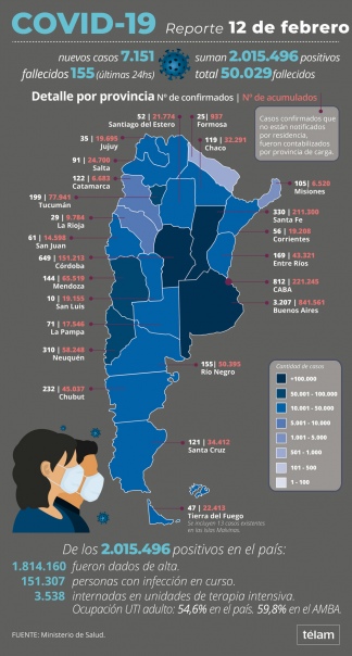 El Ministerio de Salud de la Nación también informó que la totalidad de casos positivos asciende a 2.015.496, de los cuales 1.814.160 son pacientes recuperados y 151.307 son casos confirmados activos.
