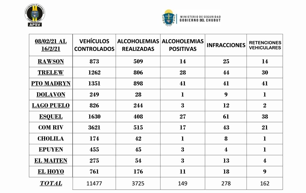 En Puerto Madryn se realizaron controles vehiculares en distintos puntos de la ciudad donde se verificaron 1351 vehículos en los puestos de control. Se detectaron 41 test positivos de 898 controles de alcoholemia realizados. Se labraron 41 actas de infracción a la Ley Nacional de Tránsito y se retuvieron 41 vehículos por alcoholemia y demás infracciones graves.