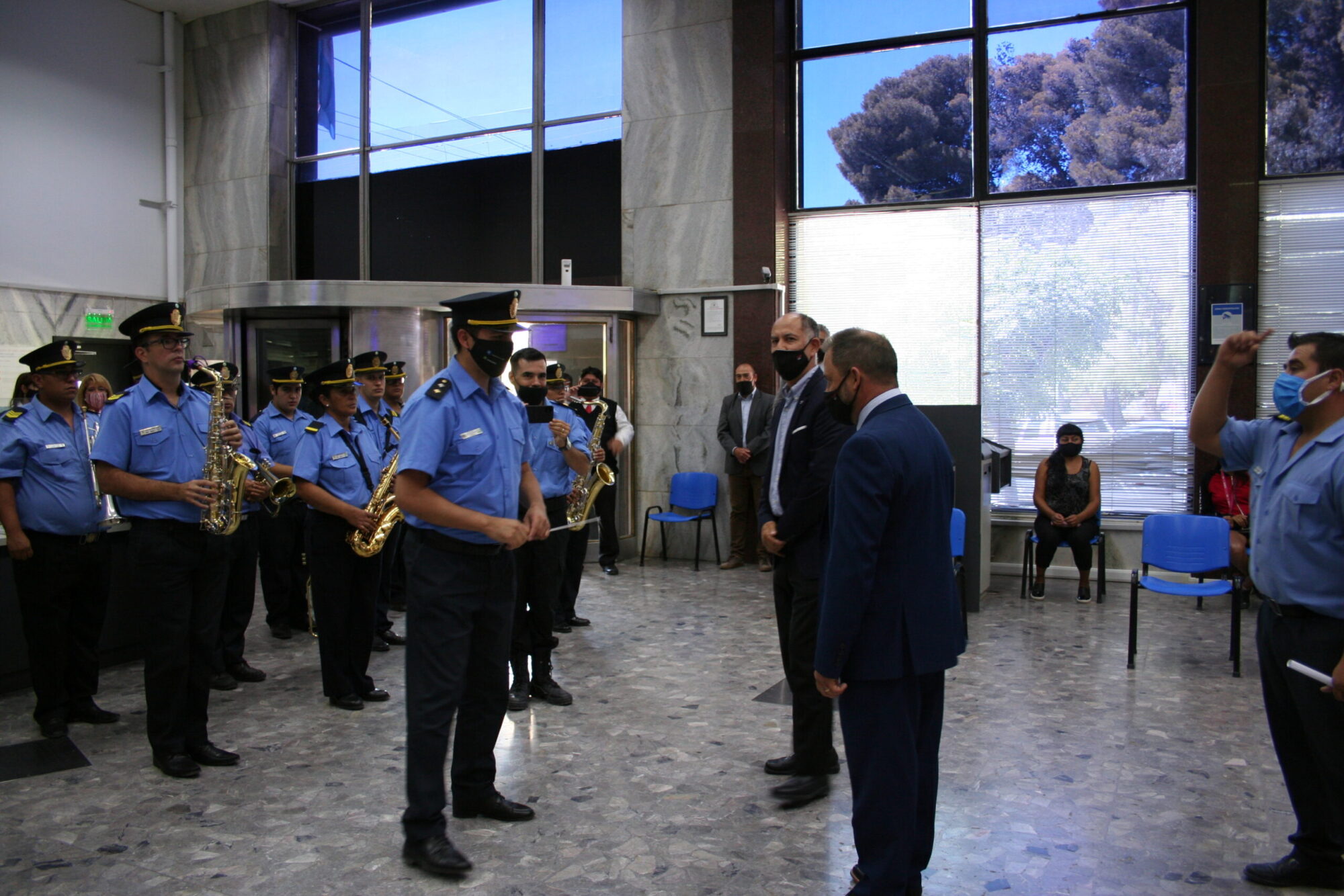 Repentinamente la banda ingresó a las instalaciones de la sucursal y tras hacer sonar una de las tradicionales marchas, su director, Darío Quintraman, se dirigió a los presentes para invitarlos a la presentación. Posteriormente saludó al Gerente General del Banco, Gustavo González, agradeciendo la colaboración para desarrollar esta convocatoria.