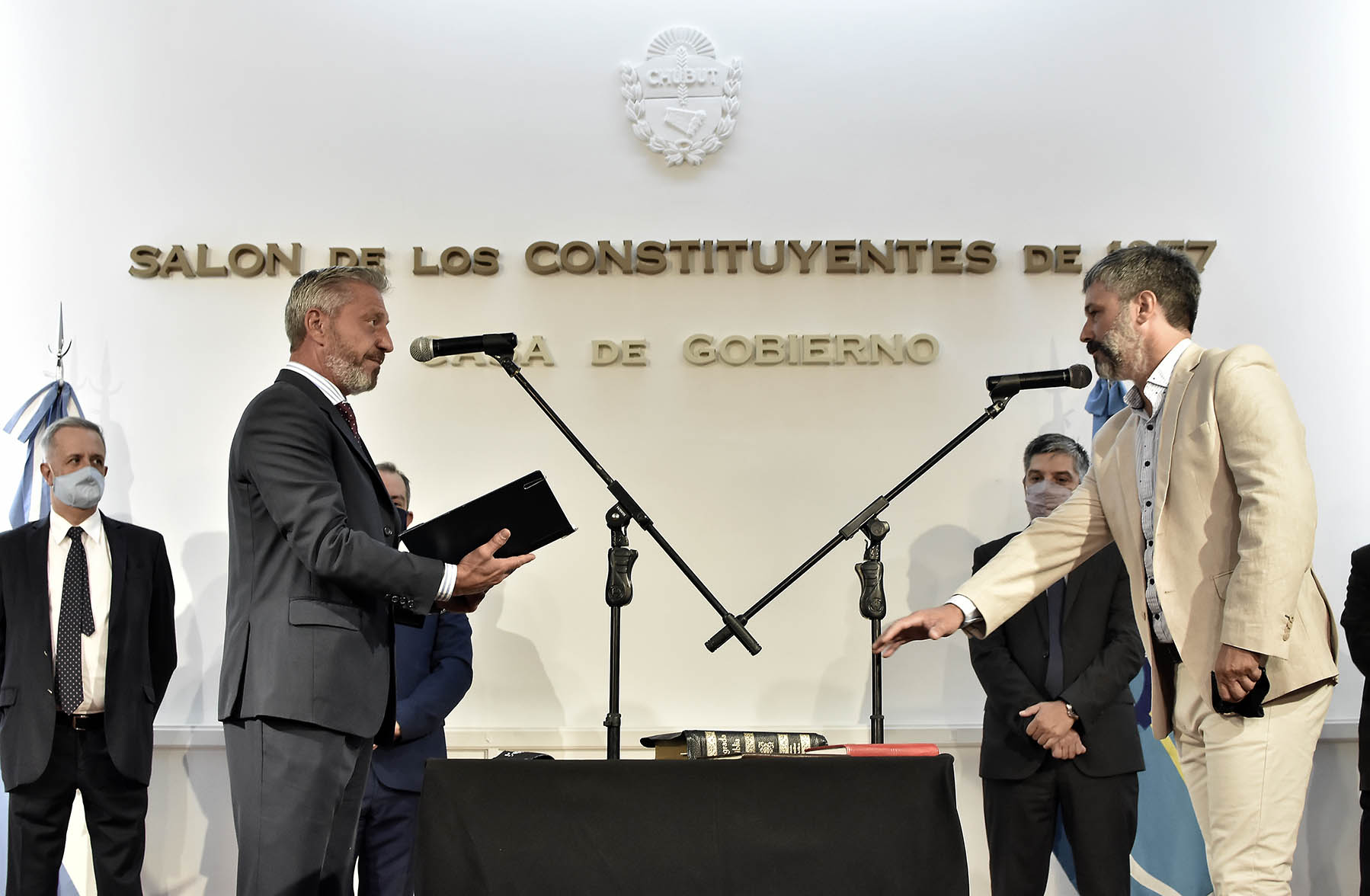 El escribano general de Gobierno, Marcelo Lizurume efectuó la lectura del acta de asunción Nº 41, la cual fue rubricada por el mandatario provincial y miembros de su gabinete.
