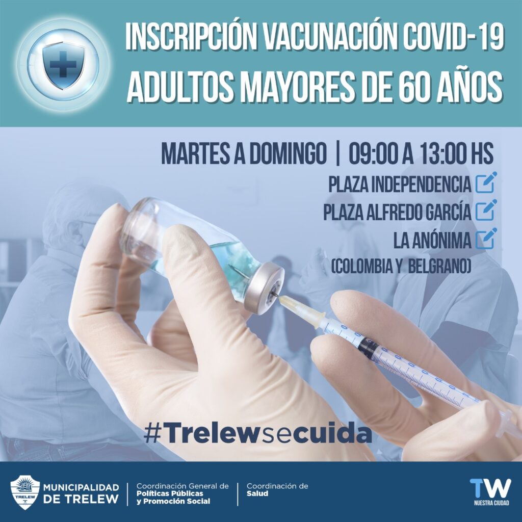 La coordinadora de Salud del Municipio, Cecilia Vera dijo que este martes “a partir de las 9 de la mañana vamos a estar acompañando lo que es esta campaña de vacunación. Desde la Municipalidad, a través de la Coordinación de Salud se va hacer la inscripción de adultos mayores de 60 años que todavía no pudieron inscribirse”. Para esto, el Ministerio de Salud de la Provincia puso a disposición de la comunidad la página www.vacunate.chubut.gov.ar.