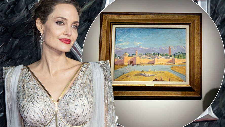 Dos hombres cargan una pintura con guantes en las manos. En ella puede verse un paisaje en amarillos y azules con la luz del sol pegando desde una esquina. Se trata de “Torre de la Mezquita Koutoubia” del ex primer ministro del Reino Unido, Winston Churchill, la cual fue recientemente vendida por 11.5 millones por su anterior dueña, Angelina Jolie.