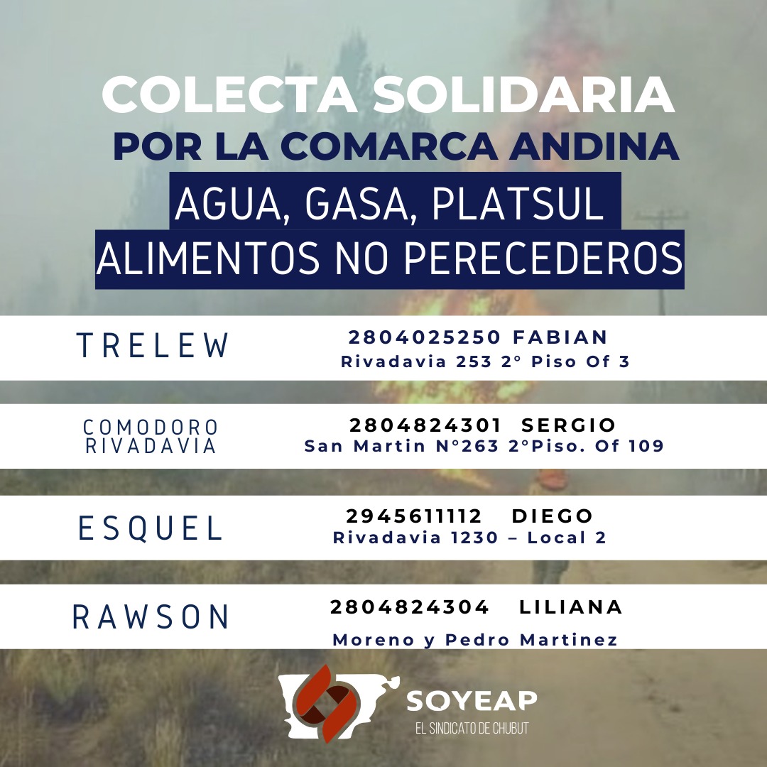 Atentos a la situación que atraviesan los vecinos de la cordillera, muchos sectores comenzaron a realizar colectas para ayudar a los damnificados por los incendios en la Comarca Andina. Desde el Sindicato de Obreros y Empleados de la Administración Pública (SOyEAP) se están recepcionando variados elementos que puedan ser de utilidad para asistir en esta emergencia, como agua, ropa, gasas, Platsul, artículos de higiene y alimentos no perecederos entre otros. Las donaciones pueden acercarse a la sede Trelew del sindicato, en Rivadavia 253 (2º piso, oficina 3).