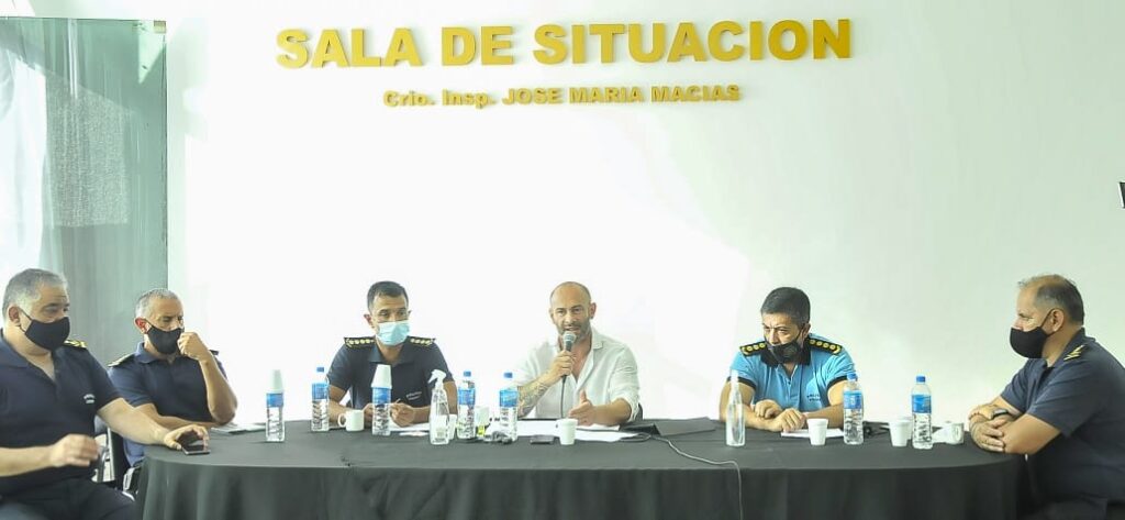 El ministro Federico Massoni y toda la cúpula de la Policía del Chubut intentando explicar la escasa participación en la seguridad del Presidente.