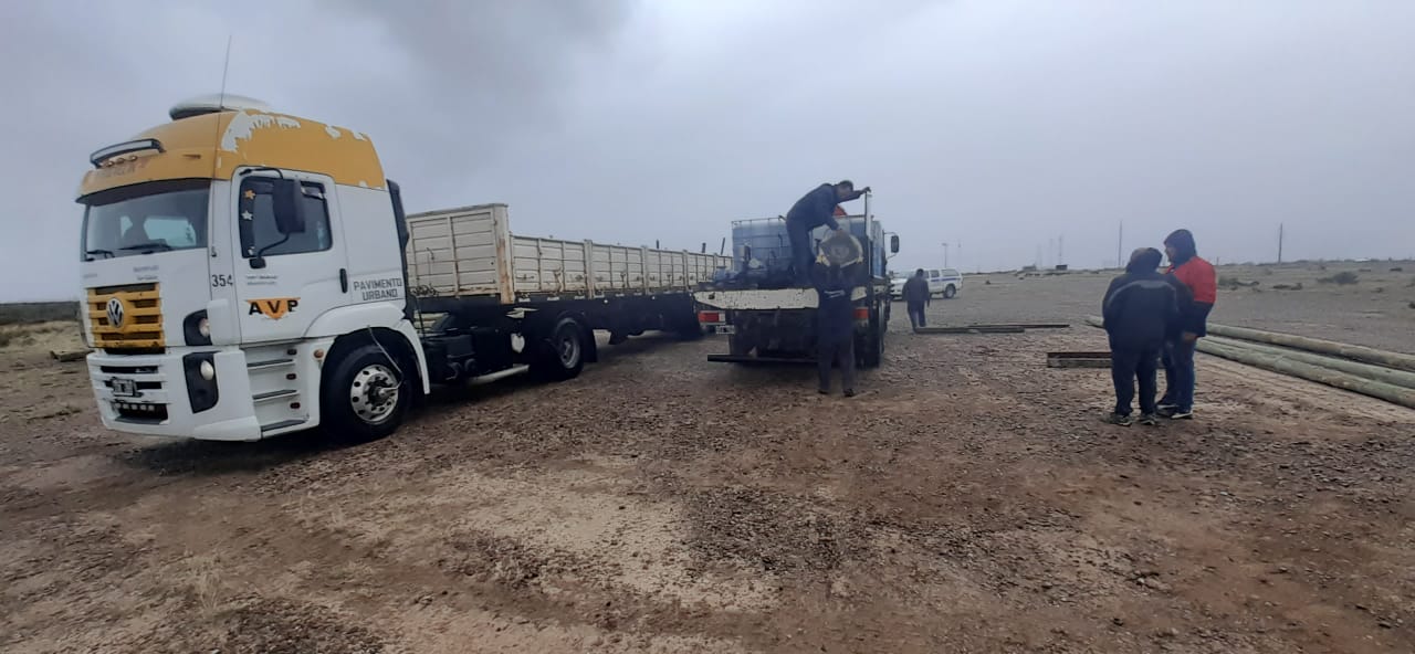 En esta oportunidad, dos camiones con acoplado, uno de ellos se cargó en Rawson con postes de luz aportados por la Dirección General de Servicios Públicos para la reconstrucción del tendido eléctrico destruido por las llamas. Mientras que el otro, se cargó en la localidad de Sarmiento con fardos de pasto aportados por el Ministerio de Agricultura, Ganadería, Industria y Comercio y demandados por los afectados.