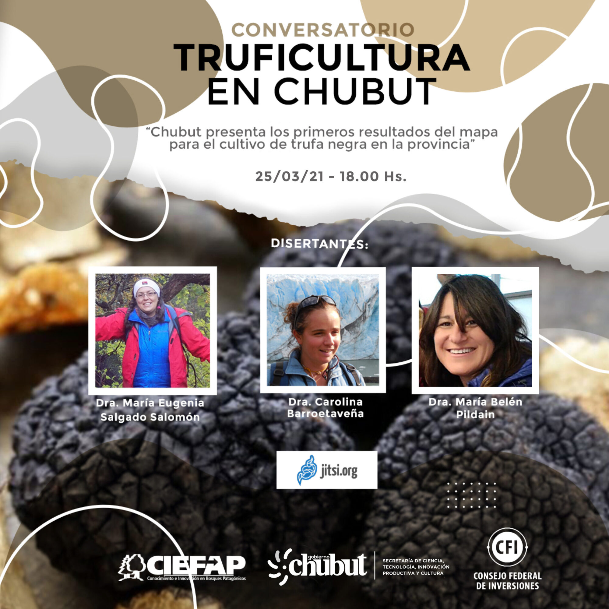 Dicha presentación se llevará adelante en conjunto con el Ministerio de Agricultura, Ganadería, Industria y Comercio; el Consejo Federal de Inversiones (CFI) y el Centro de Investigación y Extensión Forestal Andino Patagónico (CIEFAP), quienes realizarán el jueves 25 de marzo a las 18 horas, un Conversatorio virtual para presentar los avances en el proyecto “Mapa de zonificación potencial para el cultivo de Trufa Negra” en tres cuencas productivas de la provincia del Chubut.
