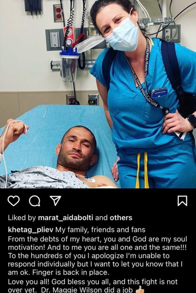 Tras el hecho, el peleador ruso de 37 años –que ocupó el décimo lugar en la categoría de 96 kg en los Juegos de Londres– realizó un posteo en Instagram para llevar tranquilidad: “Mi familia, amigos y fans ¡Son la motivación de mi alma! Les pido disculpas a todos ustedes. Quiero hacerles saber que estoy bien, el dedo está nuevamente en su lugar. Esta lucha aún no ha terminado. La Dra. Maggie Wilson hizo un gran trabajo”.