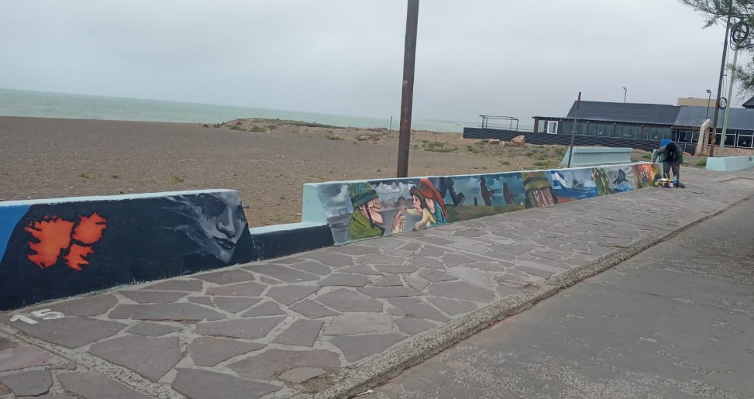 “Cuando comienza la guerra es enviado a Malvinas, y en ese momento, en la batalla de Monte Harriet (del 11 al 12 de junio 1982), él sueña que va a morir y decide escribirle una carta a la novia. En el mural se ve a la mujer de este joven con la carta en la mano. Ese escrito puede leerlo quien se acerque a playa”, señaló.