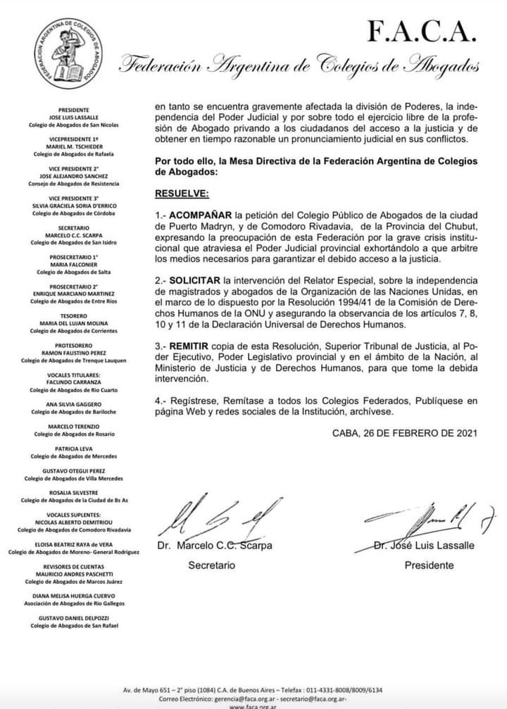 “Es así, que con fecha 26 de febrero de 2021, la Mesa Directiva de FACA emitió su resolución, acompañando la petición de nuestro Colegio, expresando su preocupación por la crisis institucional que atraviesa nuestra Provincia y solicitando la intervención del Relator Especial sobre la Independencia de Magistrados y Abogados de la Organización de las Naciones Unidas, en el marco de lo dispuesto por la Resolución 1994/41 de la Comisión de Derechos Humanos de la ONU, y asegurando la observación de los artículos 7, 8 10 y 11 de la Declaración Universal de Derechos Humanos”, sostiene el escrito al que tuvo acceso Metadata Noticias.