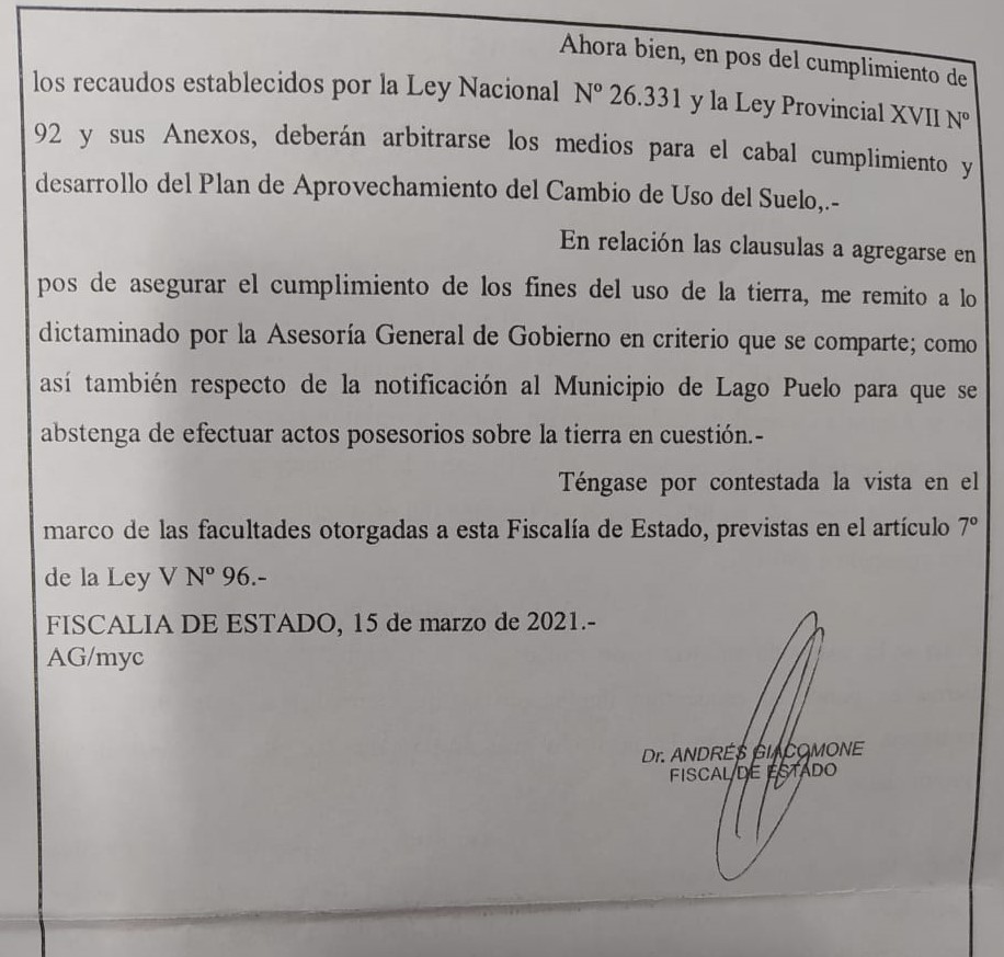 “En relación a las cláusulas a agregarse en pos de asegurar el cumplimiento de los fines del uso de tierra, me remito a lo dictaminado por la Asesoría General de Gobierno en criterio que se comparte; como así también respecto de la notificación al municipio de Lago Puelo para que se abstenga de efectuar actos posesorios sobre la tierra en cuestión”, advierte Fiscalía de Estado.