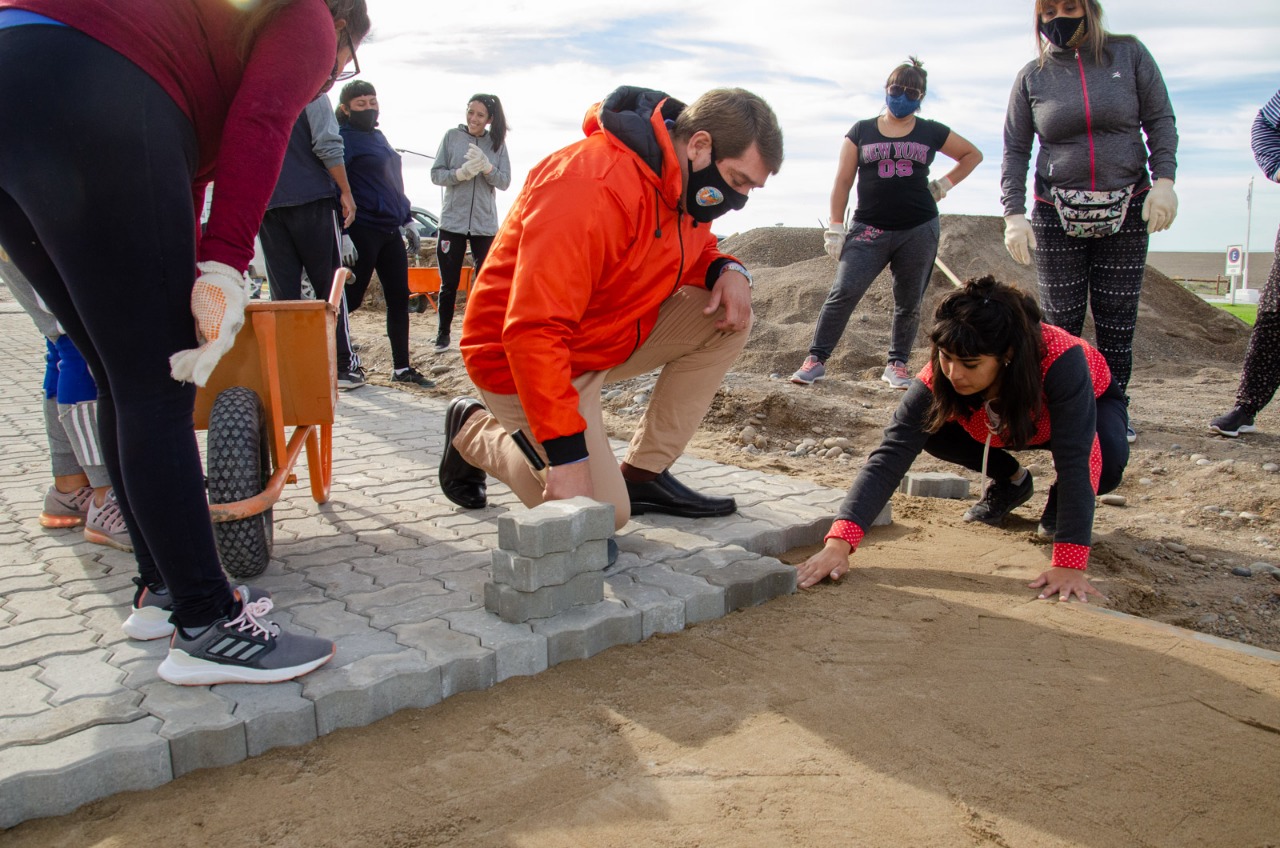 El intendente de Rawson, Damián Biss, participó de la capacitación sobre colocación de adoquines que están realizando las integrantes de la cooperativa de mujeres “Mirando al futuro” que -en esta primera etapa-, apuntan al embellecimiento urbano de distintas arterias de la ciudad.