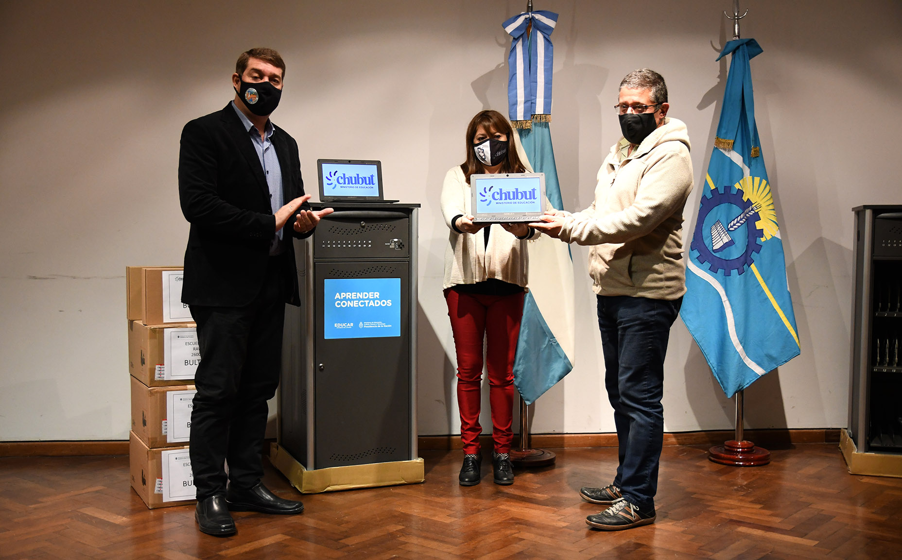 La entrega fue encabezada por la ministra de Educación, Florencia Perata; acompañada por el subsecretario de Recursos, Apoyo y Servicios Auxiliares, Claudio Marquez; el intendente de Rawson, Damián Biss, y las autoridades de ambos establecimientos educativos.
