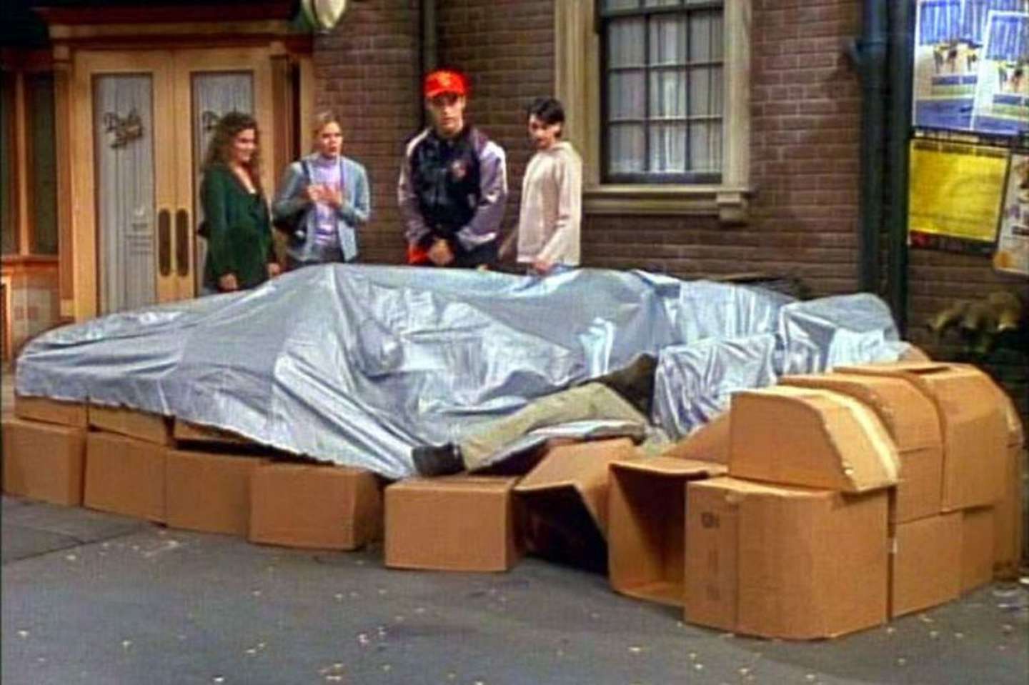 El problema llegó cuando el dueño real del auto apareció y se lo llevó. ¿Cómo siguió Joey sosteniendo esa mentira? Con una curiosa idea: apiló cajas y las tapó con una lona para que parezca que debajo de la misma había un Porsche.