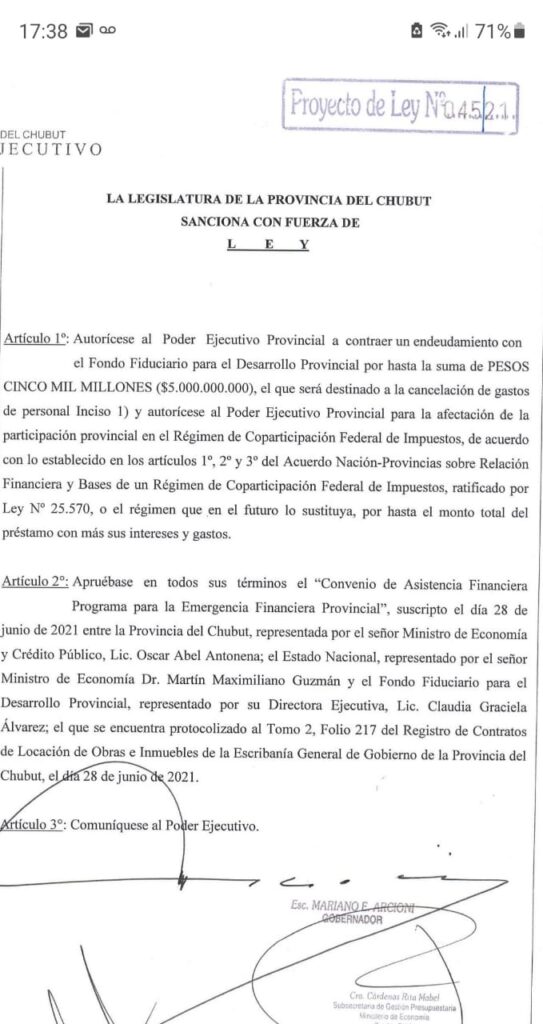 Metadata accedió en exclusiva al proyecto de ley que lleva la firma del gobernador Mariano Arcioni y los ministros Oscar Antonena (Economía) y José Grazzini (Gobierno) que busca la autorización de la Legislatura para tomar una nueva deuda por $ 5.000 millones.