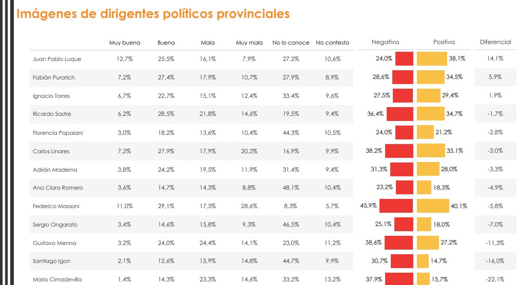 La encuesta exhibe números ajustados para la mayoría de los dirigentes políticos de Chubut, salvo excepciones donde predomina ampliamente la imagen negativa, como en el caso del gobernador Mariano Arcioni y el dirigente radical Mario Cimadevilla.