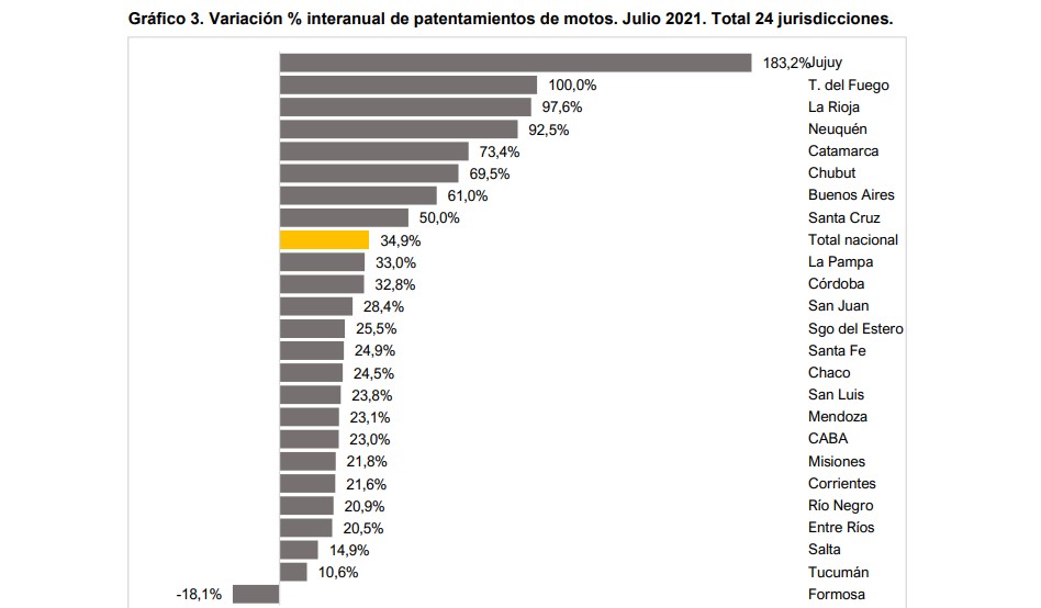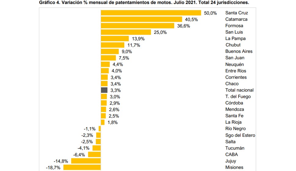 Más atrás aparece la provincia Patagónica de Neuquén con un alza del + 92,5% y Catamarca con el + 73,4%. En el sexto lugar figura Chubut con un crecimiento en el patentamiento de motos durante julio del + 69,5%.