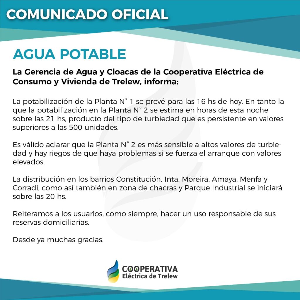 La Cooperativa Eléctrica de Trelew, a través de la Gerencia de Agua y Cloacas, informó que la potabilización de la Planta N° 1 se prevé para las 16 horas de hoy.