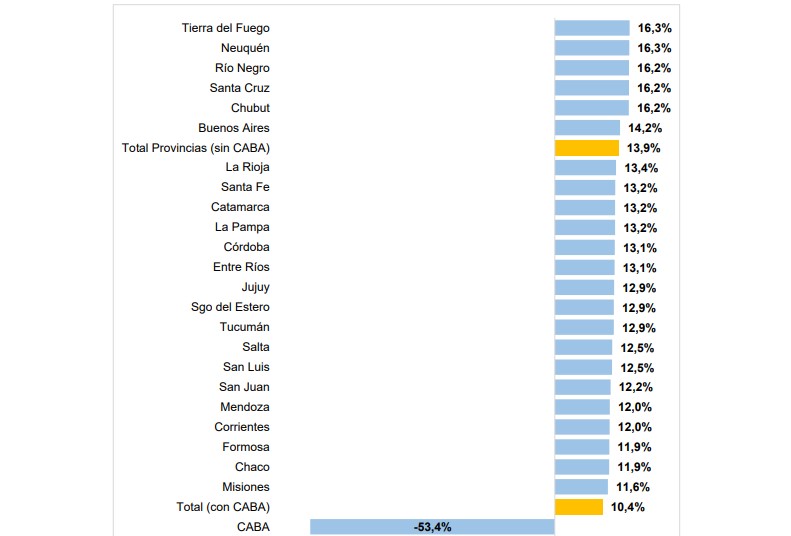 El podio lo cerró Tierra del Fuego con un aumento del 9,5% interanual. Más atrás se posicionó Neuquén con un 9,4 por ciento de incremento y cerró el top five Río Negro con 9,1%.