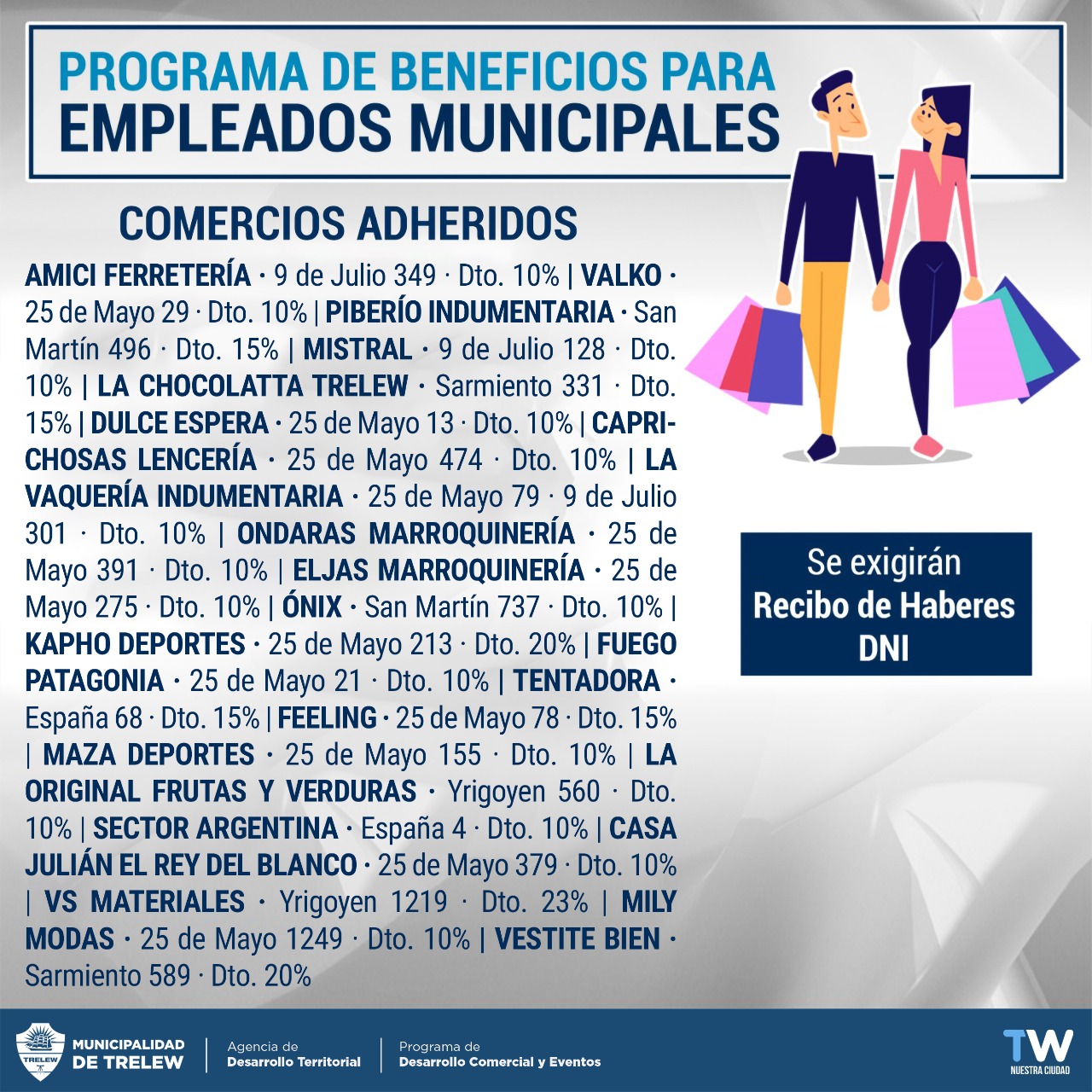 La Municipalidad de Trelew sigue brindando importantes beneficios para los empleados municipales en variados comercios de la ciudad, con descuentos del 10%, 15% y 20% en el total de las compras realizadas. Los mismos se aplicarán tanto a compras en efectivo como aquellas que se realicen mediante pago a través de tarjetas de débito. Para esto debe presentarse DNI y recibo de sueldo.
