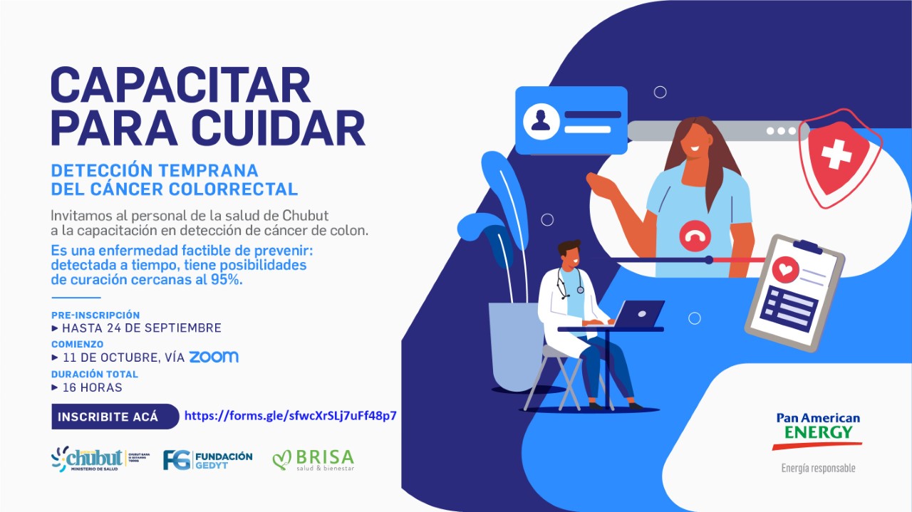 El Ministerio de Salud del Chubut, que conduce Fabián Puratich, invita a todos los trabajadores del Primer Nivel de Atención de la Salud a participar del Programa de Capacitación en Cáncer Colorrectal, el cual será dictado de forma virtual por la propia cartera sanitaria provincial, la Fundación de Gastroenterología Diagnóstica y Terapéutica (GEDYT), Brisa Salud y Pan American Energy (PAE).
