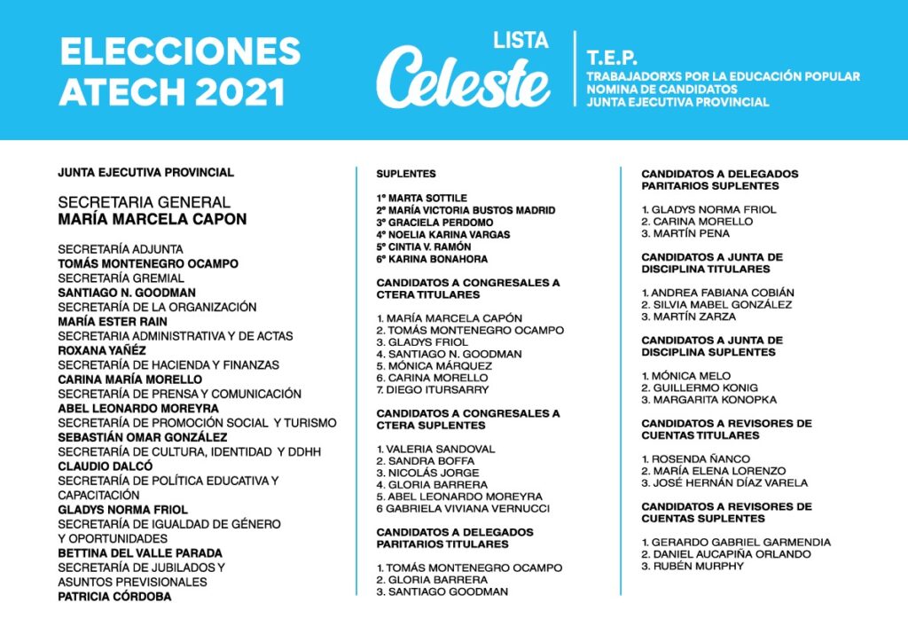 Por la lista Celeste, la Junta Ejecutivo Provincial está compuesta por Capón como secretaría general; Tomás Montenegro como secretario adjunto; Santiago Goodman como secretario gremial; y Carina Morello como secretaria de Hacienda y Finanzas.