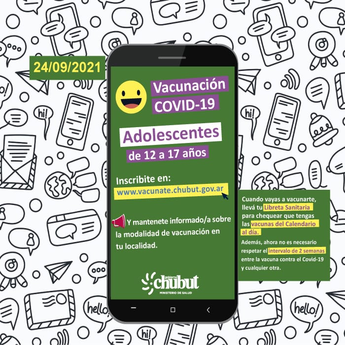 El Gobierno del Chubut, a través del Ministerio de Salud provincial, que conduce Fabián Puratich, convoca a los adolescentes de entre 12 y 17 años de todo el territorio provincial a que se inscriban en el registro oficial de la Campaña “Chubut Vacunate” (el sitio web www.vacunate.chubut.gov.ar), para posteriormente poder vacunarse contra el COVID-19 en los vacunatorios de cada localidad.