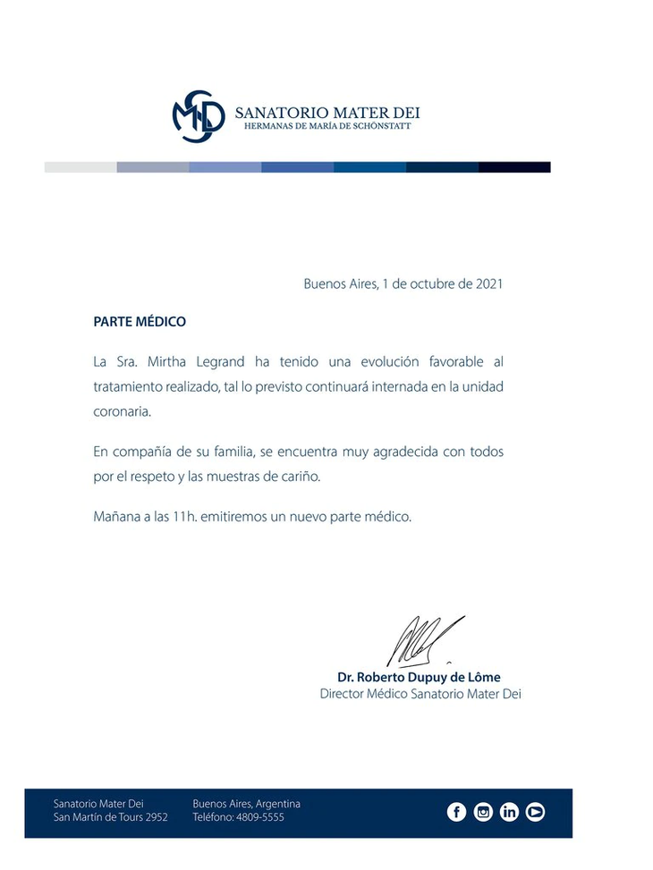 “La señora Legrand ha tenido una evolución favorable al tratamiento realizado, tal lo previsto continuará internada en la unidad coronaria. En compañía de su familia, se encuentra muy agradecida con todos por el respeto y las muertas de cariño”, reza el comunicado firmado por Roberto Dupuy de Lôme, director del centro médico.