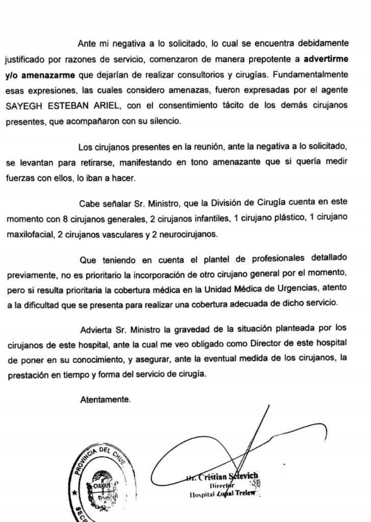 Metadata accedió en exclusiva a una nota que presentó el Director del Hospital Zonal de Trelew, Cristian Setevich, el 12 de octubre, día el que existió una reunión con un grupo de cirujanos, entre los que se encontraban Carminatti, Arnolds, Barbarisi, Trouboul, Sayegh y Triana. En la cumbre también estuvo presente el Director Asociado, Fernando González, quien fue testigo de lo acontecido en el encuentro.