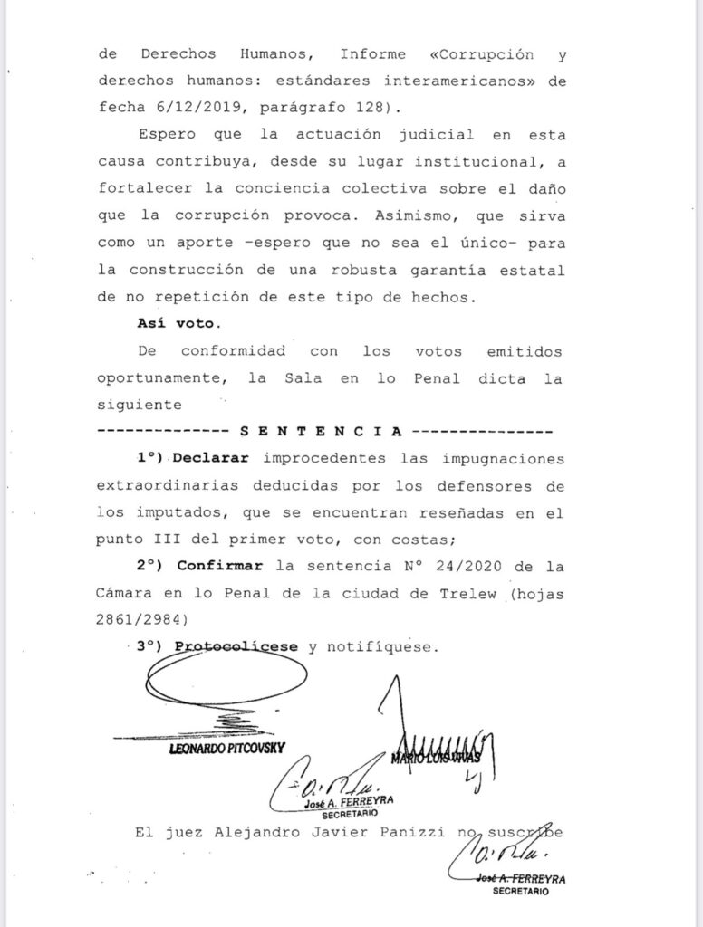 El fallo, que tiene la autoría de los ministros Alejandro Javier Panizzi, Mario Luis Vivas y, en carácter subrogante, Marcelo Leonardo Pitcovsky, ratifica la condena dictada en 2020 por la Cámara Penal de Trelew en el expediente caratulado “Correa, Diego Miguel y otros p.s.a. asociación ilícita s/impugnación extraordinaria”, tras declarar improcedentes las impugnaciones planteadas por los abogados defensores de los acusados.