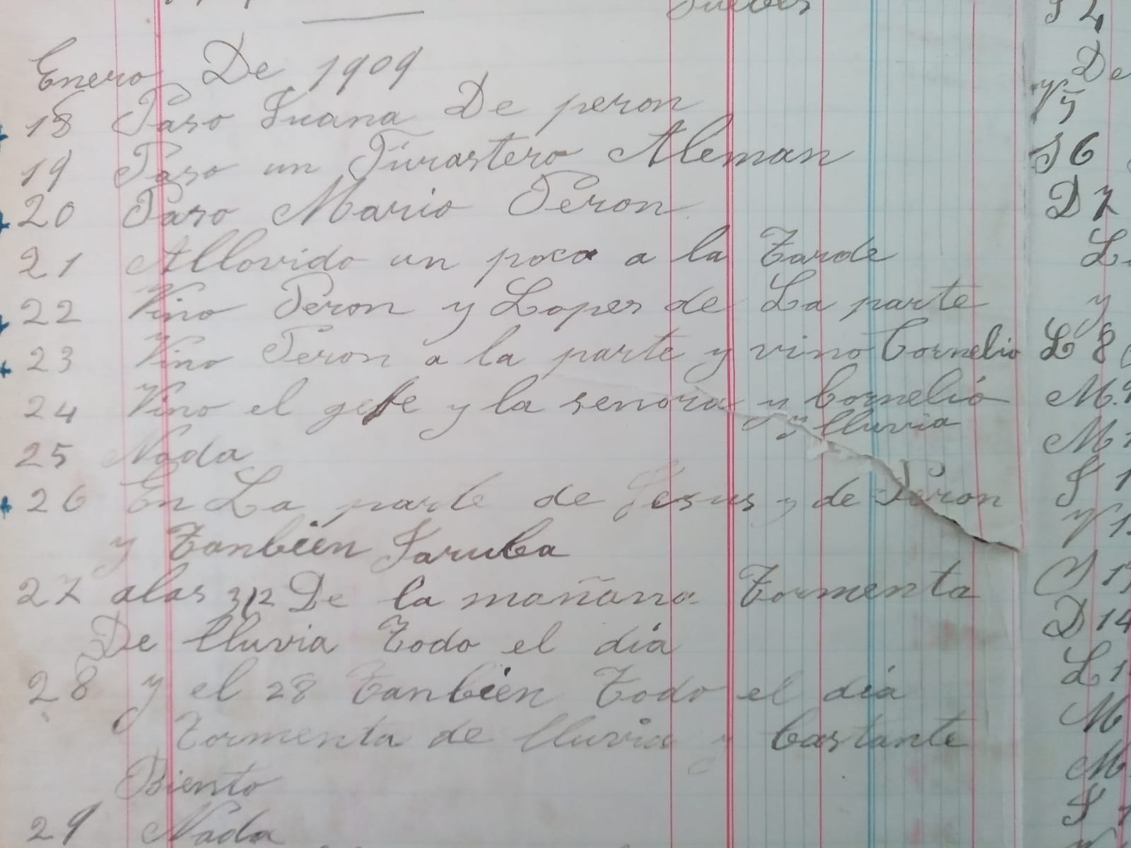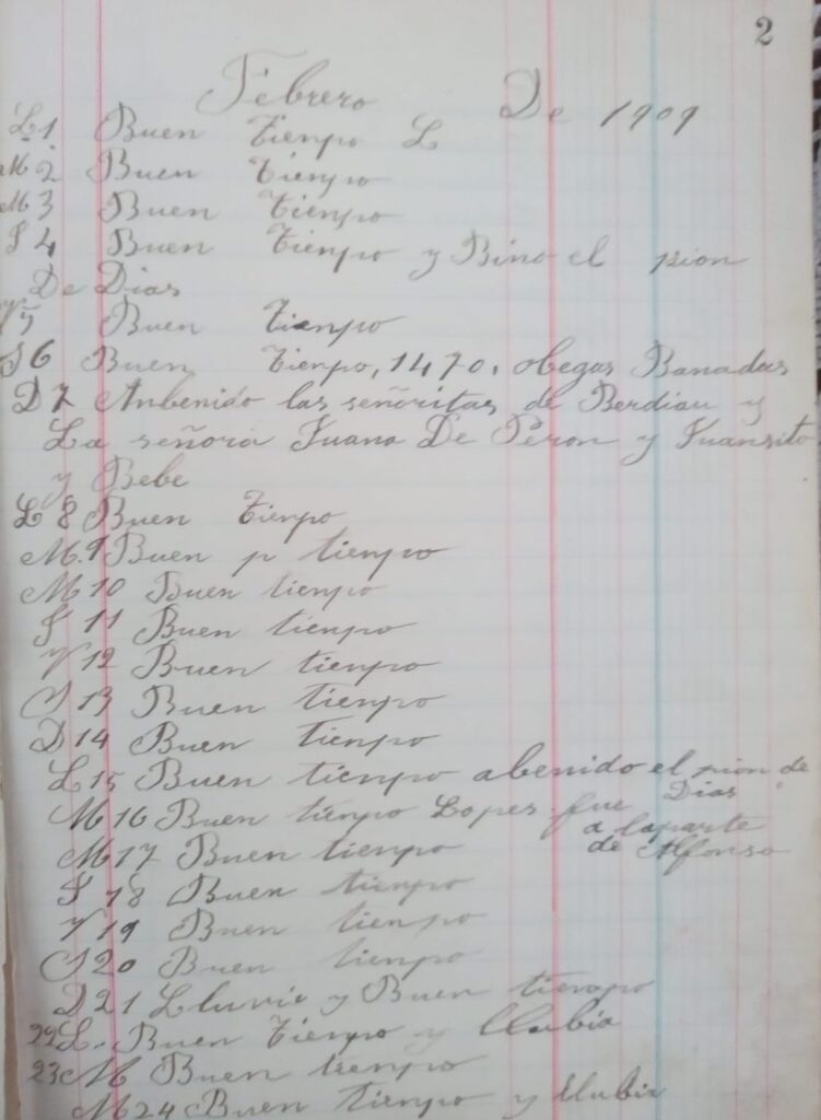 “Vinieron Perón y López de La Parte”, quedó asentado en el registro un 22 de enero de 1909. Los últimos días de ese mes, el libro deja sentado que hubo “lluvia todo el día y viento”, en tanto que el 29 dice que no ocurrió “nada”.