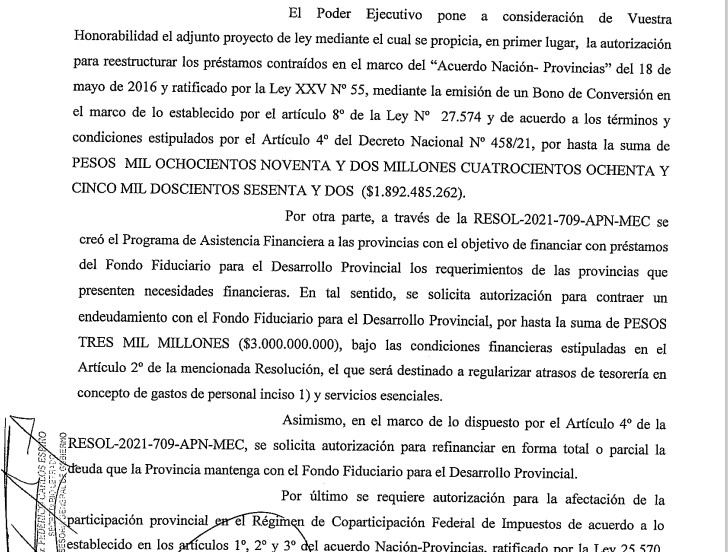 El artículo 3 del proyecto al que accedió Metadata solicita autorización para contraer un endeudamiento con el Fondo Fiduciario para el Desarrollo Provincial por hasta la suma de $ 3.000 millones, que será destinado a regularizar atrasos de tesorería en concepto de gastos del personal y servicios esenciales.
