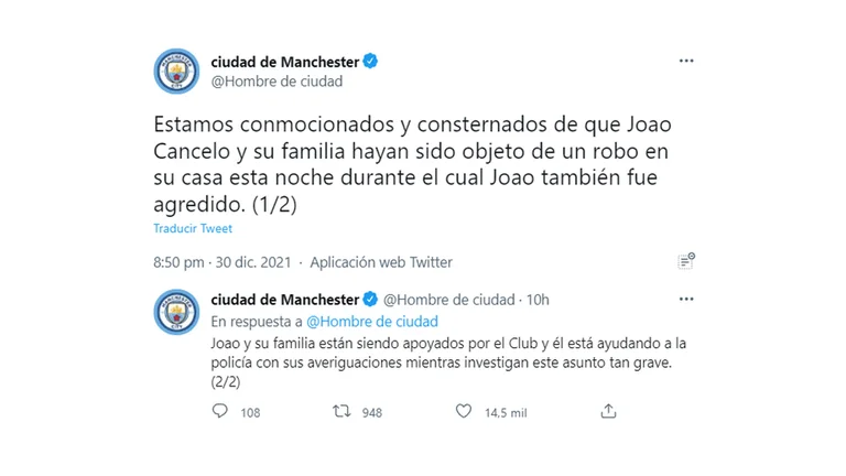 Luego de que se hiciera pública la noticia, el club inglés emitió un breve comunicado brindándole su apoyo al ex Benfica, Valencia, Inter y Juventus. “Estamos shockeados y consternados de que Joao Cancelo y su familia hayan sido sometidos a un robo en su casa esta noche, en el cual Joao también fue agredido”. Los Ciudadanos además recalcaron que “Joao y su familia están siendo apoyados por el Club” y que “él está ayudando a la policía con sus averiguaciones mientras investigan este asunto tan grave”.