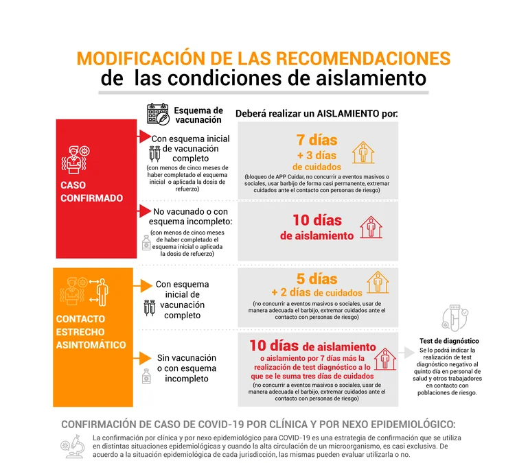 La medida implicaba, además, que las personas que sean contactos estrechos asintomáticos sin vacunarse o con el esquema incompleto, el aislamiento se reducirá a 7 días con un test PCR negativo o, si no se cuenta con el examen, se mantendrán los actuales 10 días, al igual que para aquellos que resulten positivo y no se hayan vacunado.